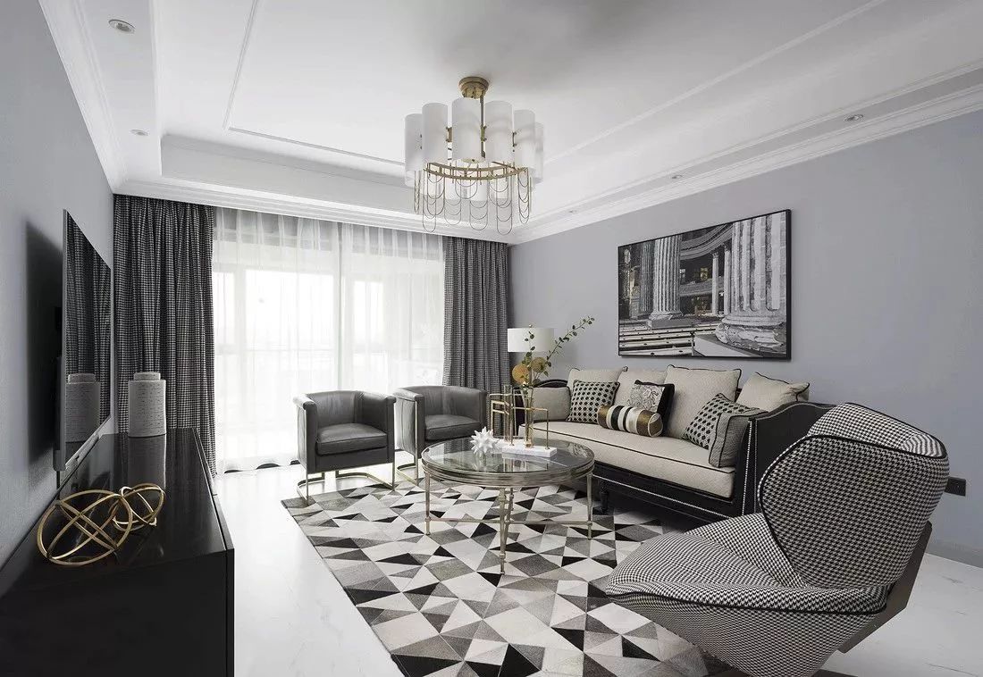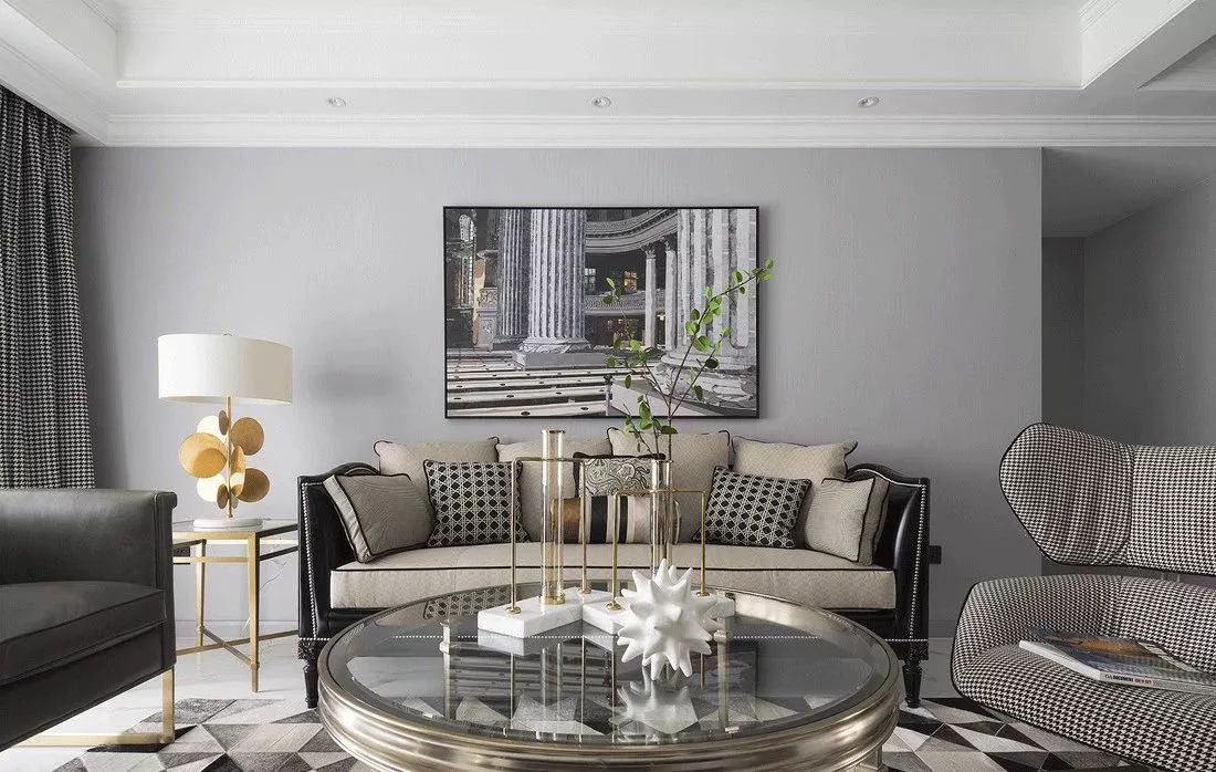 客厅整体采用高级灰色系,金色元素的加入提升了空间精致度,并带来轻奢的韵味。黑白色软装将经典配色运用的淋漓尽致。简单的石膏线造型吊顶,丰富了空间层次感,搭配精心挑选的软装饰品,展露出屋主精致不将就的生活态度。