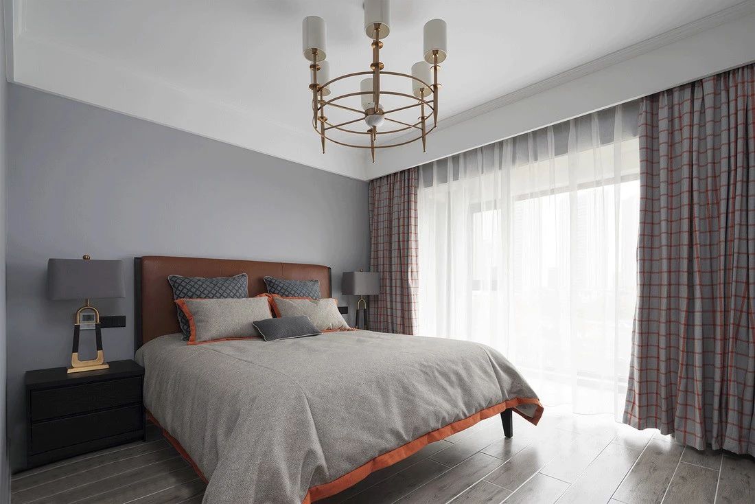 主卧大片落地窗堪称理想的生活的典范,优雅低调的灰色,沉稳安静,为屋主营造一个温馨安逸的睡眠环境。