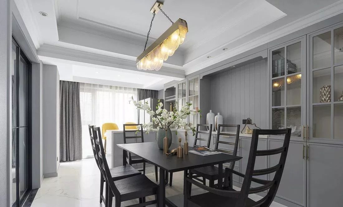 餐厅空间,巨大的展示柜在增大储物空间的同时,也与整个色调及风格相呼应,黑色餐桌椅搭配时尚吊灯,意境十足,让用餐时间都变得美妙起来。
