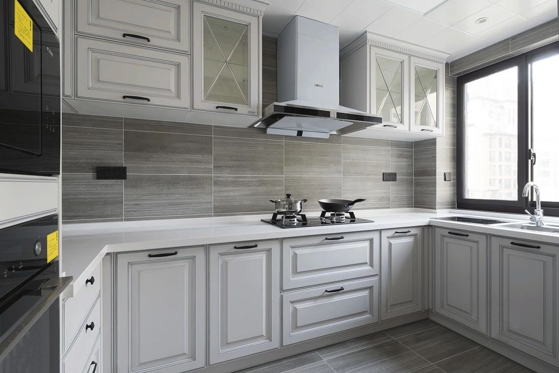 U型厨房布局,操作简洁,白灰色的橱柜明亮干净又不显单调,让烹饪生活变得简约而雅致。