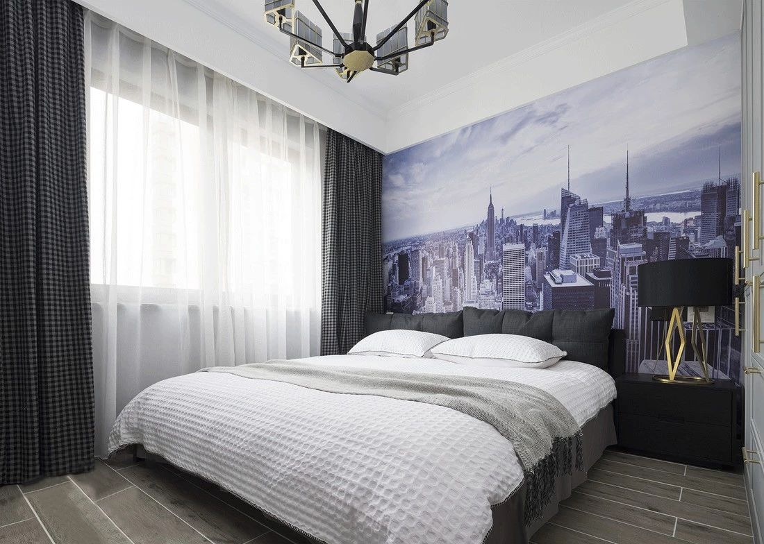 次卧更具时尚摩登感,都市化的壁纸极具个人色彩,同样黑白灰的搭配,让空间散发着独特的气质。