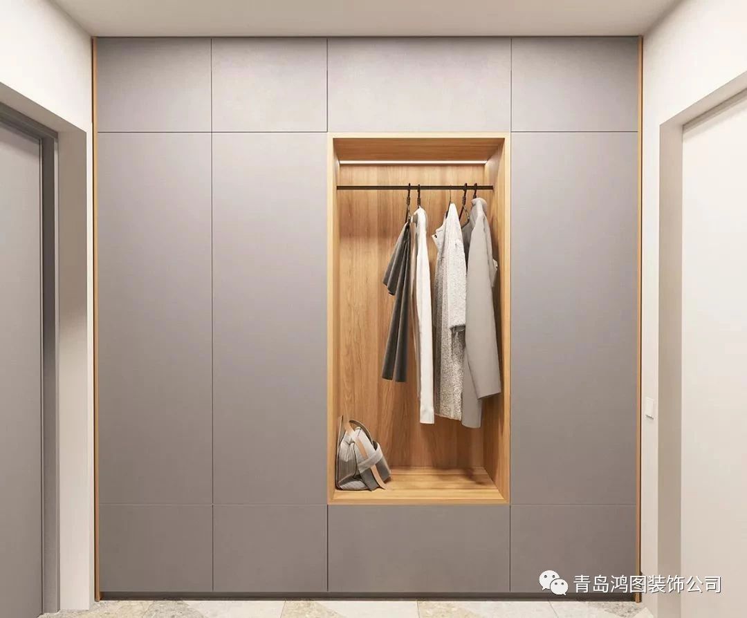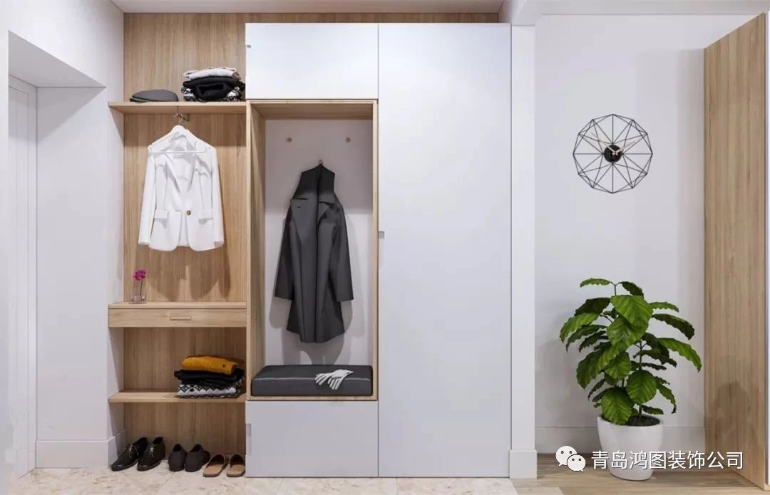 衣柜的内部结构,或外观造型,都可以根据自身的需求与喜好做选择。比如:做成上下皆有柜子,中部留空置物的;或衣柜结合换鞋凳设计,立面简洁又富有层次的;还有一种在留白的墙面安装几个挂衣钩,以便随手悬挂下班回家后的外套、包包和围巾,也能让入户区域更趋实用,“闲置”的墙面空间得到更加丰富的运用。