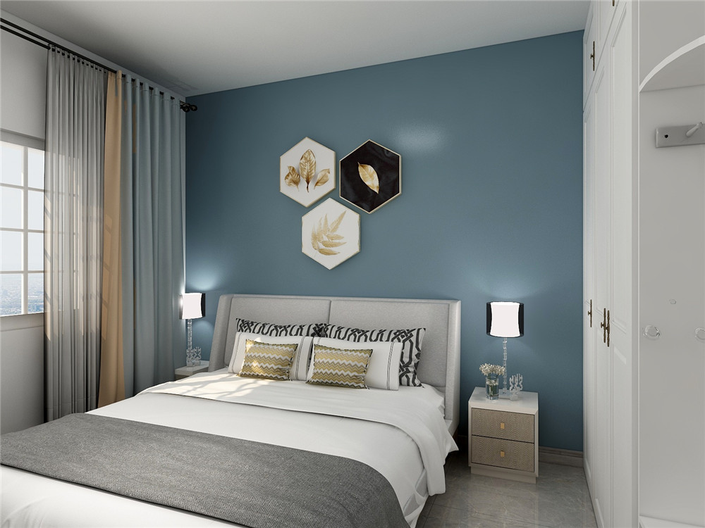 主卧和次卧的明显差异就是床头背景墙单独调色起到一个很明显的视觉差异。给人眼前一亮的感觉。搭配不同的装饰画,让两个卧室空间有着截然不同的感觉。