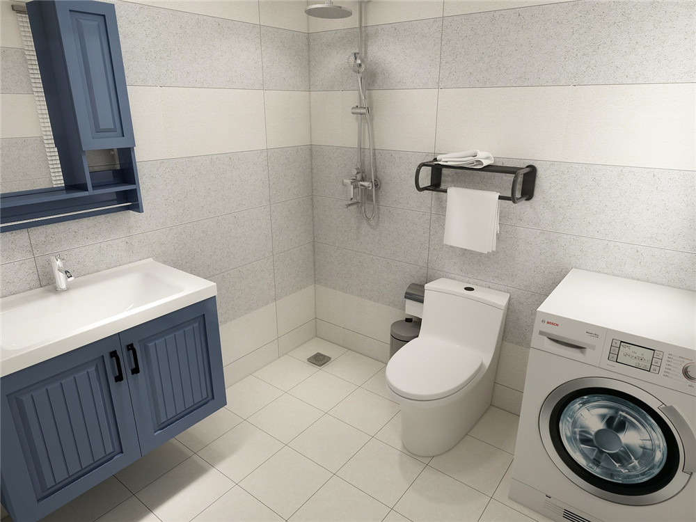 卫生间浴室柜与客厅色彩相搭配,起到相互呼应的效果。卫生间的整体空间比较大,洗衣机的空间也可以预留出来。整体渐变瓷砖的拼贴让卫生间立体感和时尚感更加强烈