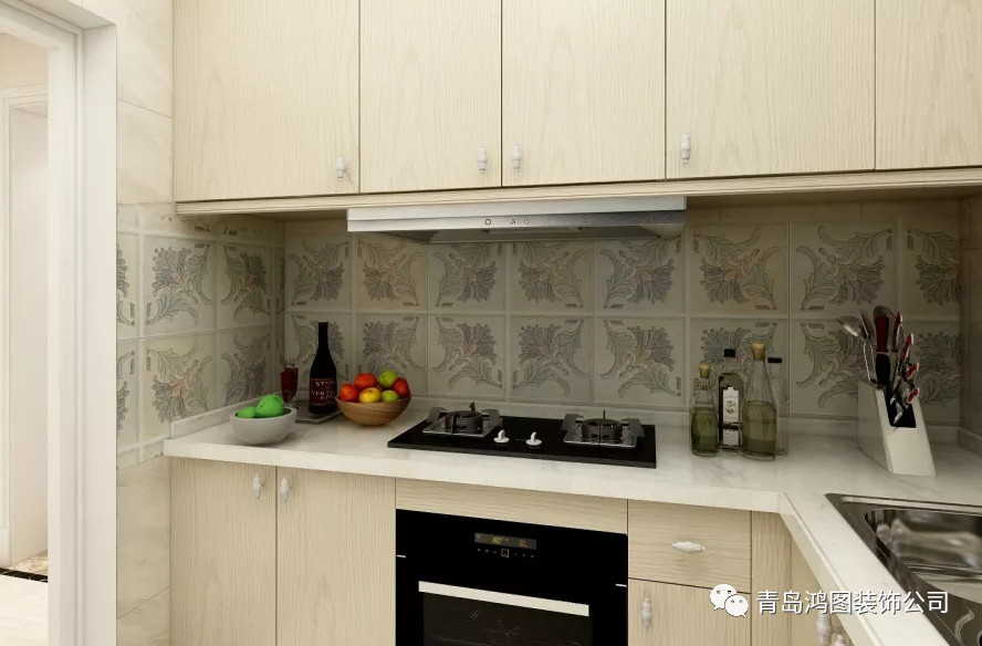 U型厨房布局,花纹墙砖增强了整个空间的质感,浅色橱柜搭配理石台面,干净明亮,美观实用。
