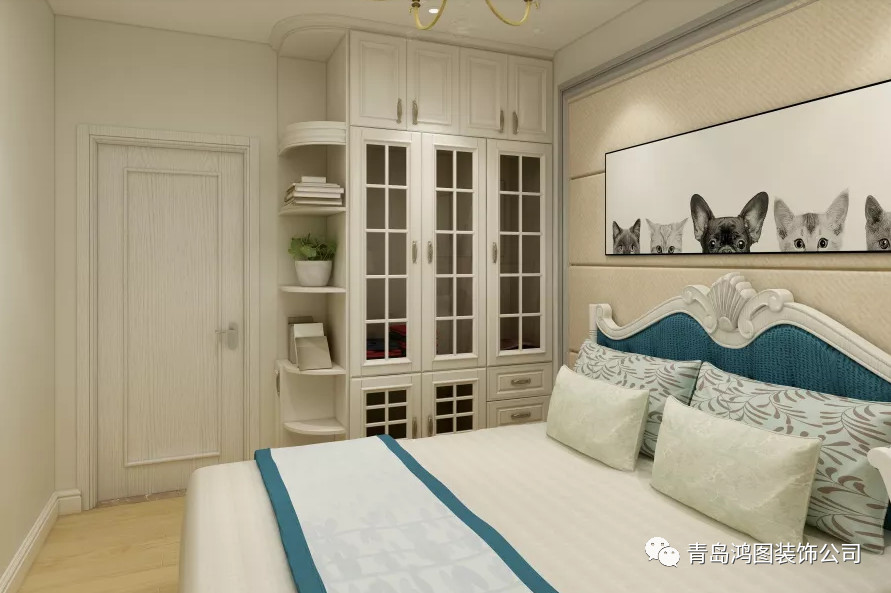 纯白浪漫的次卧空间,迎面吹来的是来自海洋清新的海风,蓝白相间的床品,如蓝天白云,让人心情明朗。搭配动物挂画,活泼十足。通顶半透明衣柜,真的是让储物一点烦恼都没有。