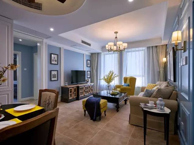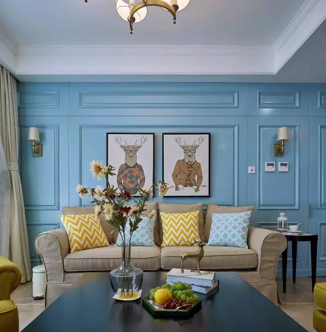 客厅空间,浅蓝色的背景墙辅以白色的线条,再加上复古的家具,韵味十足。浅色的沙发搭配彩色的抱枕,真的超级耐看。把电视柜的样式做旧,复古的样式把电视背景墙衬托的十分有感觉,再用黄花点缀,给人一室的好心情。