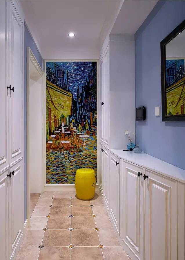玄关处两边的墙壁都做了储物柜,收纳烦恼一扫而光。尽头一整面墙的画作十分吸人眼球,使整个空间的艺术感瞬间提升。
