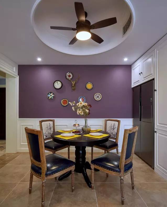 餐厅与客厅相连,紫色的背景墙挂满了各种装饰品,很是别致。小圆桌和圆形的吊顶相呼应,再搭配上这个复古的吊扇灯,整个空间都完美和谐。满足你生活中的小确幸。