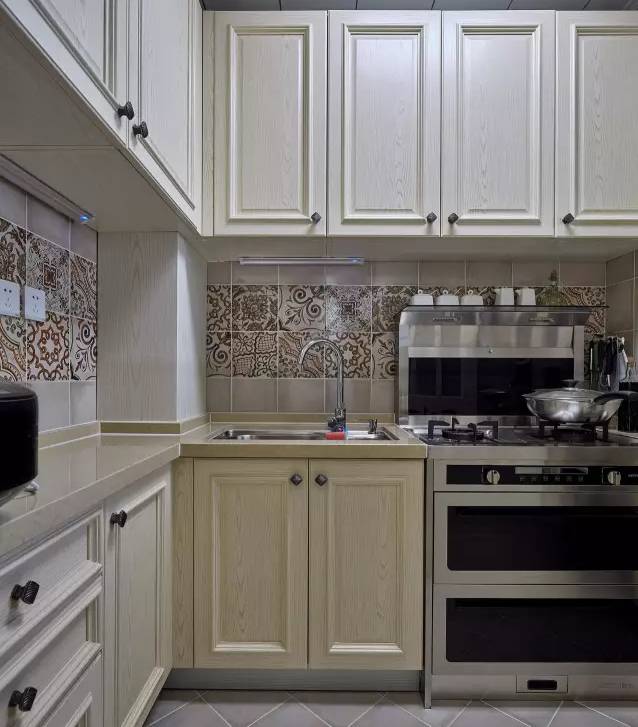 L型厨房布局,素雅的花砖,把整个空间的颜值都提升了不少。再加上白色的美式橱柜和现代化的电器,让厨房更加耐看和实用。