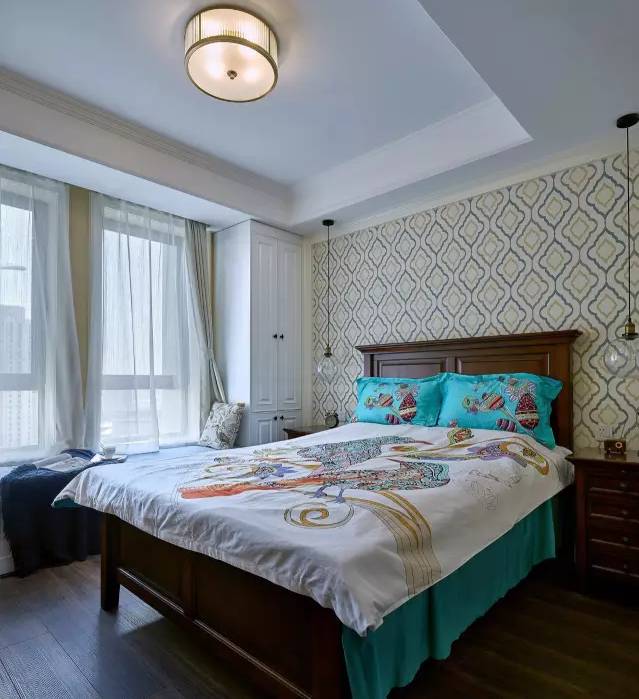 卧室空间,经典的美式大床搭配艳丽的床品装饰,减少了美式的厚重感。在窗边设计了储藏柜式的飘窗,美观实用一体化,坐在飘窗处,喝着咖啡,看着杂志,幸福的生活,美美哒~