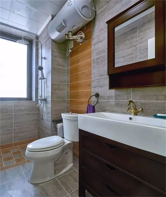 整个卫生间也是美式风格为主,不同色彩的仿木纹砖构成了一个简洁时尚的空间,格调十足。