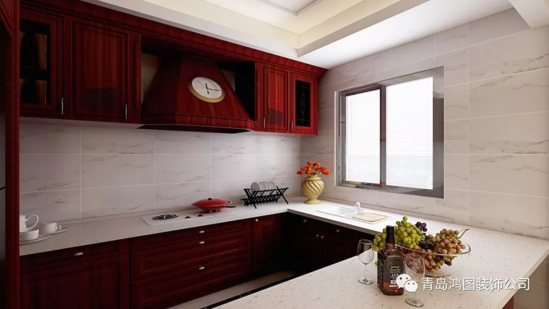 U型厨房布局,极大增加了储物空间。红木色的橱柜造型时尚,优雅华贵,搭配白色理石台面,沉稳大气,烹饪生活也可以如此优雅有格调。