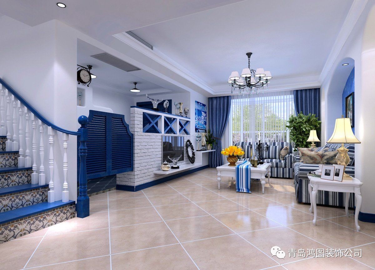 客厅整体以蓝白色作为主色调,清新自然,仿佛地中海蔚蓝色的海岸与白色沙滩。炎炎夏日,看着这样碧海蓝天的景象,心情会愉悦不少,仿佛海风轻拂过面颊,肆意沉浸在清地中海独特的梦幻中。
