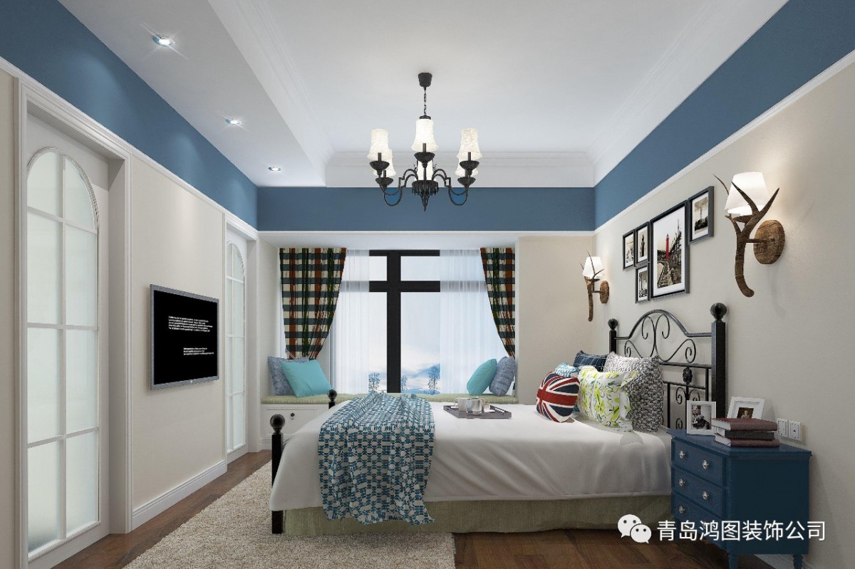 卧室将床头背景墙设计出一个拱门造型,将床铺置于期间,结合了海与天的明亮;而选用背景装饰灯作点缀,很好的烘托了氛围,让人不禁想象这是一艘航行在大海上中的船~独特的锻打铁艺家具,简单而自由延伸的线条也能勾勒出浓浓异域风情。