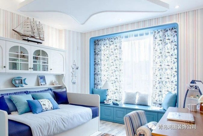 书房沿袭清新淡雅的颜色,素雅的小细花条纹格子图案是主要风格,在这样一方天地里静心阅读一本好书,身心仿佛都徜徉在地中海浪漫的海洋里。