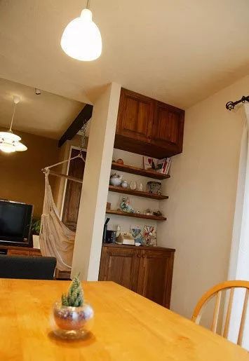 餐桌与窗户中间的一个小区域,木板搭造的分层收纳空间格外显眼。下面是木板搭造的小柜子,装入平时不太常用的物品,整洁大方。
