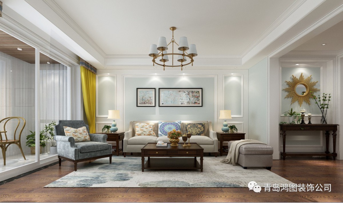 客厅与阳台之间用透明落地玻璃相隔,保证了空间的通透性。背景墙用石膏线勾勒,层次分明。搭配艺术挂画与简洁地毯,整个空间浸润着优雅与简洁,让一切忙碌从此消失。