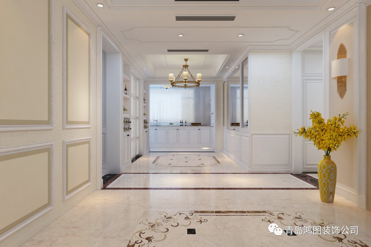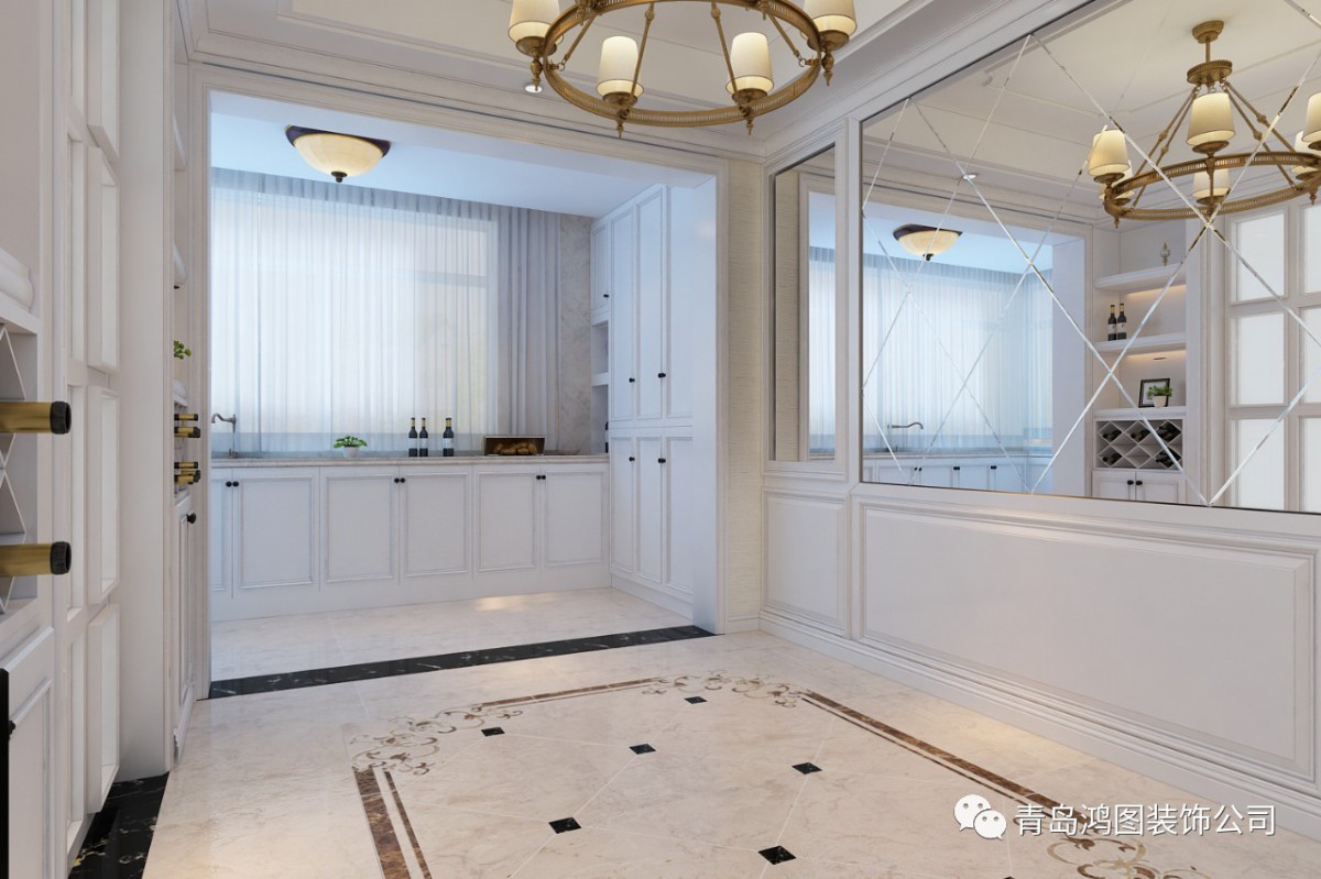 别出心裁的镜子墙,使餐厅看起来更为明亮通透,搭配复古吊灯,素洁轻盈的色线营造着浪漫的情趣,让华美的餐厅洋溢着娴静优美的气息。