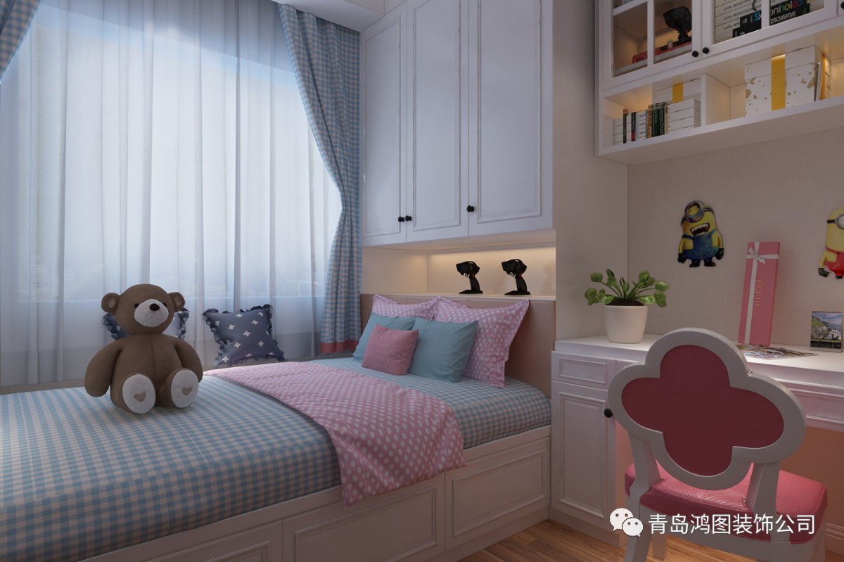 榻榻米与书柜、衣柜组合设计,合理利用空间,增加物品储纳。灰蓝色窗帘营造良好的休息环境,搭配俏皮活泼的粉色蓝色床品,给宝宝创造清新轻盈的童年生活。