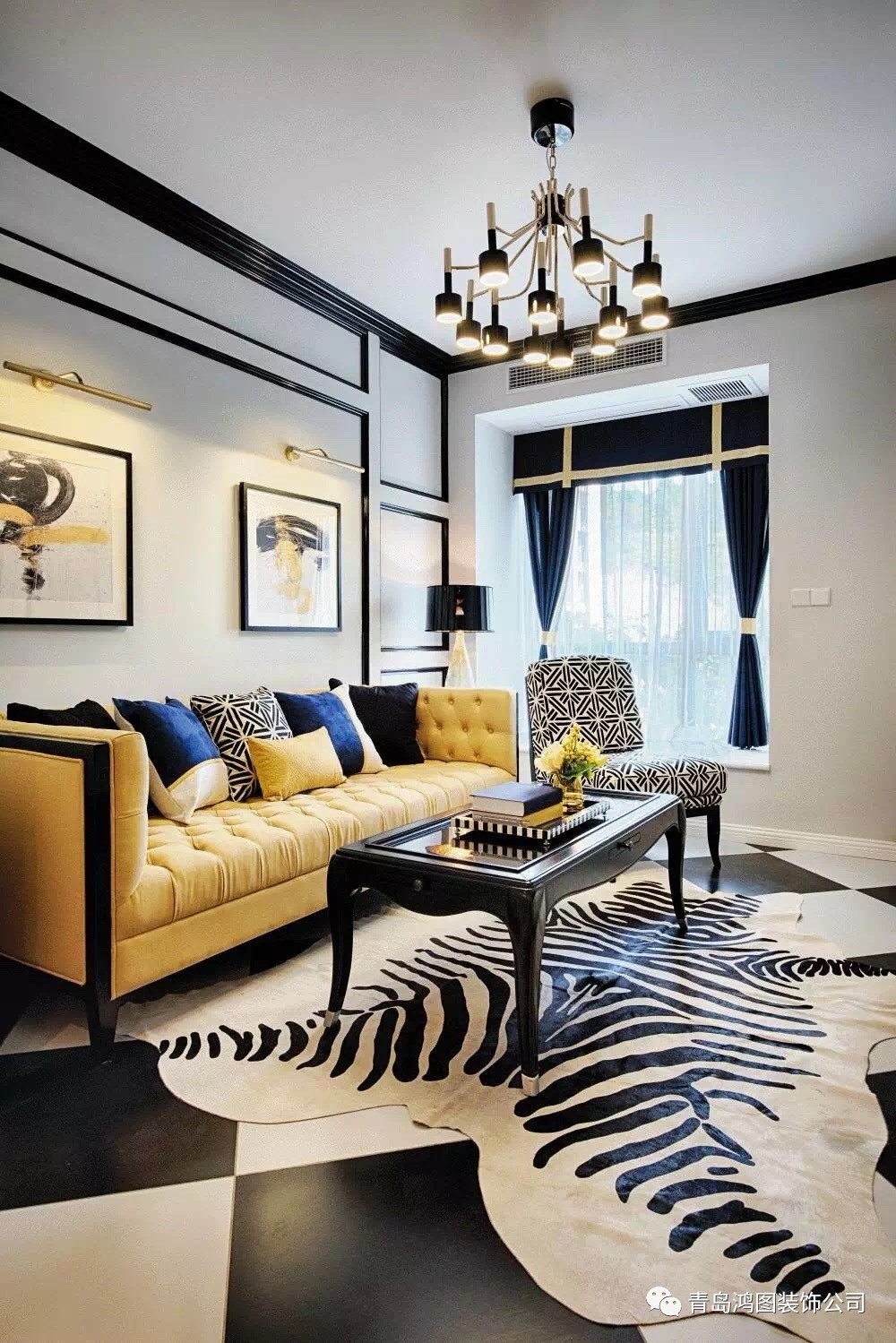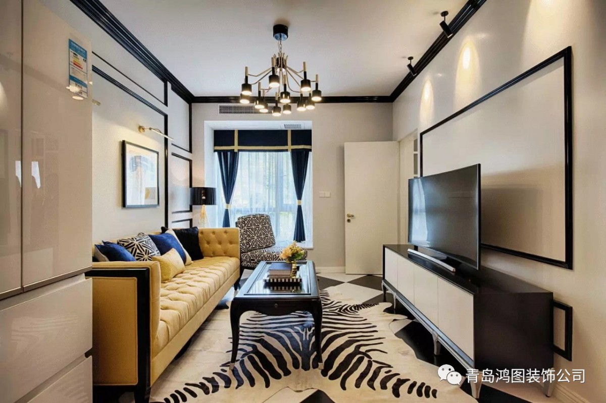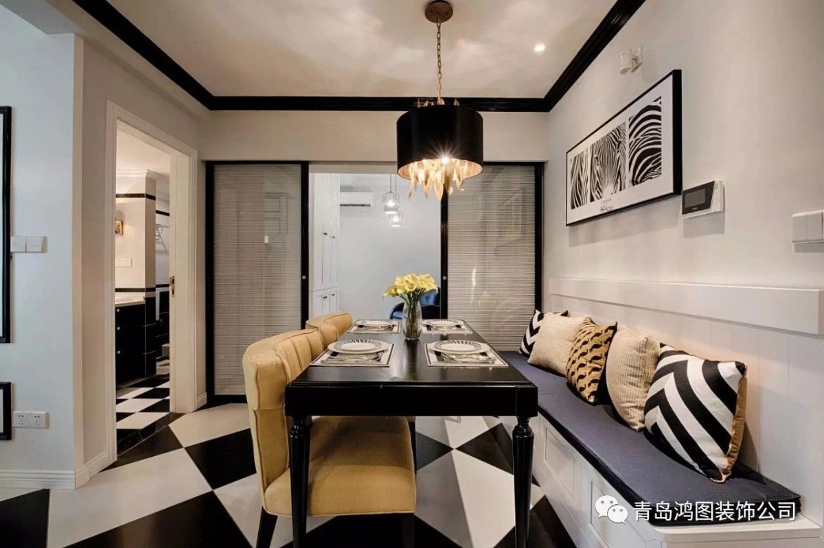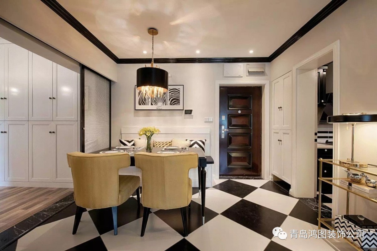 黑白主色让空间显得开阔明亮不局促,黄色色块柔化黑白的冰冷,营造出家的生活感。黑白斑马纹地毯则与黑白格地砖巧妙搭配了起来,整体更和谐,强化空间的纹理和层次。