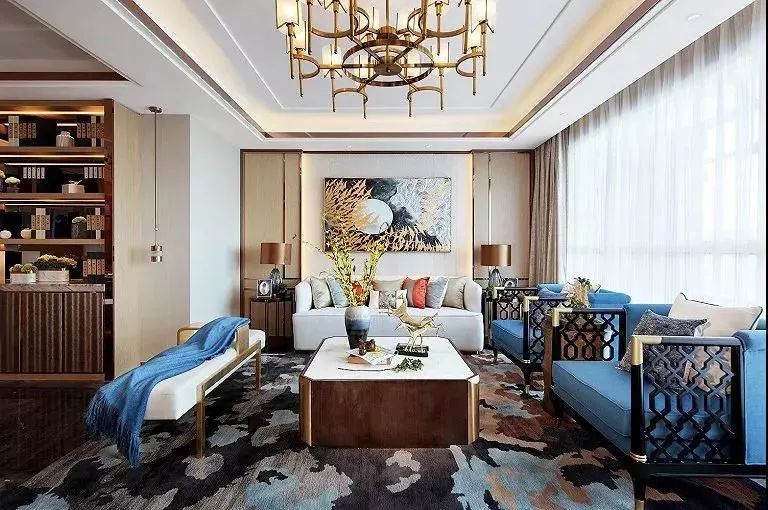 在新中式装修中融合了现代潮流元素,静谧、贵气的蓝色软装,便是其中之一。深浅不一的蓝色与传统元素相融合,十分和谐地演绎出空间的不俗魅力,营造出别具一格的气质与格调。