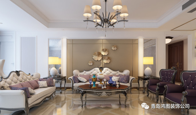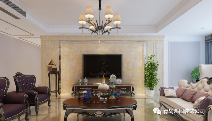 理石的电视背景墙洁净清爽,搭配藕粉色与紫色沙发,丰富空间的色彩层次和体块变化,再点缀几株绿植,强调屋主的生活品味。
