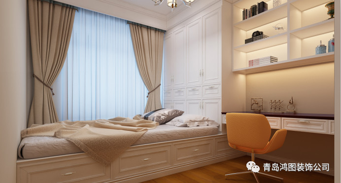 卧室,榻榻米与衣柜书柜组合设计,将原本有限的面积拓展无限的空间。米白色与香槟色调唤醒浪漫生活,实现屋主希冀的自然、温暖与沉稳的氛围。