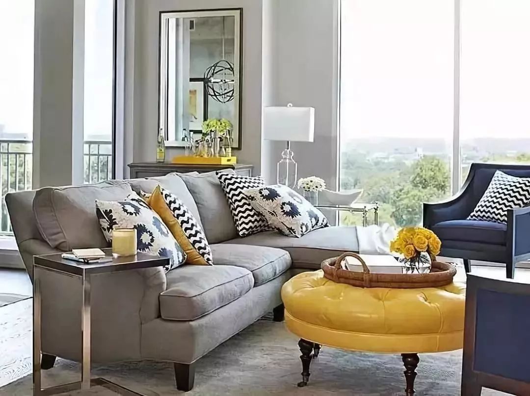 上图中深灰色沙发是主角色,背景色就是白色,黑色为配角色,点缀色是明黄色的抱枕和蓝色的单人沙发。