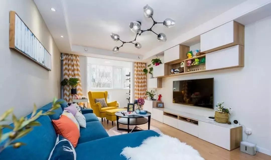 小户型的沙发一般都会选择冷色的,比如灰色、蓝色等,冷色在视觉上会给人一种收缩的感觉,这样就会显得房间宽敞些。