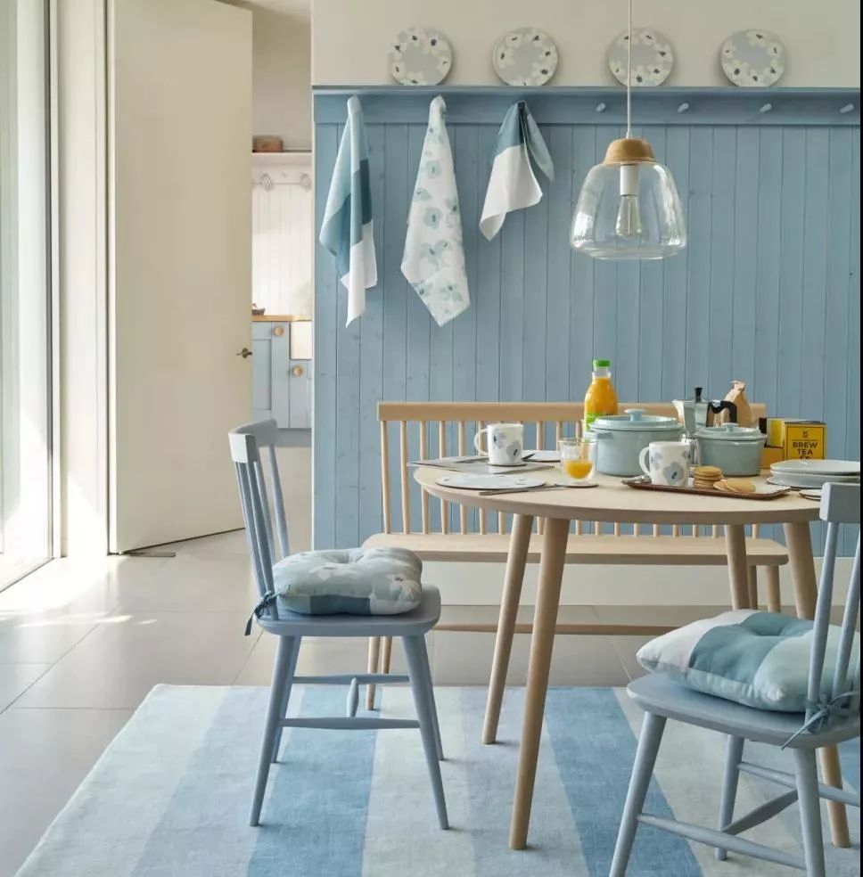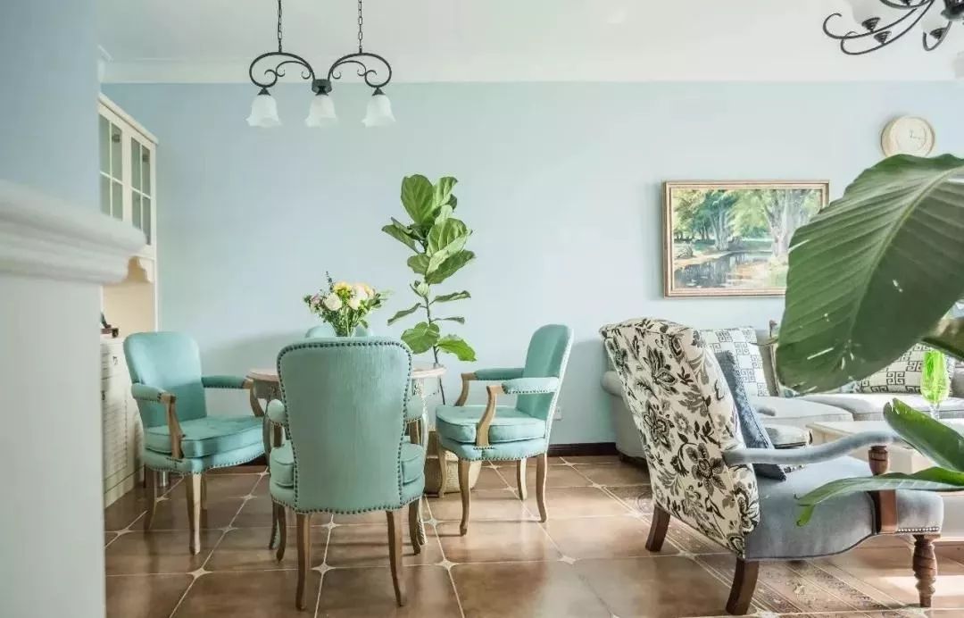 图中淡绿色的背景墙,属于冷色调,也是后退色,视觉上产生一种后退的感觉,整个空间也感觉很轻盈开阔了。