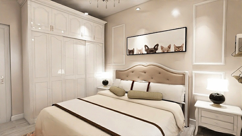 卧室空间的地板与客厅统一选择木质地板,无限接近自然。柔软的米色床铺和白色柜体搭配,整体给人很舒服的感觉。床头的动物挂画为卧室空间注入了活力,突出生活感。小台灯与小射灯的位置,将灯光合理运用,让我们觉得这样的卧室很有风情。