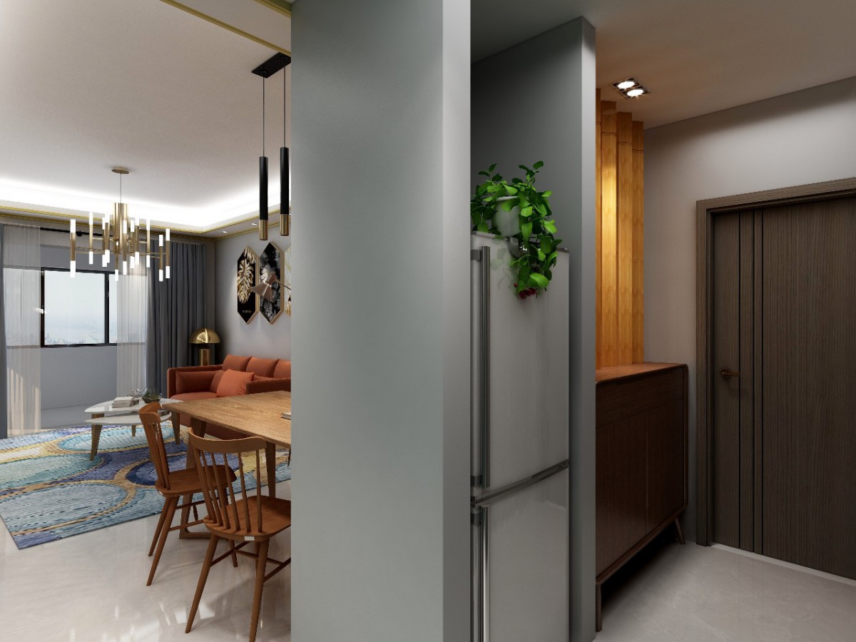 入门特设艺术隔断,避免了进门就看到客厅餐厅空间,保证了私密性,前面再放一个鞋柜,方便实用。旁边预留一小格空间用于摆放冰箱,这是一大亮点,既有设计感与另类风情,又为客厅与厨房节省了空间。
