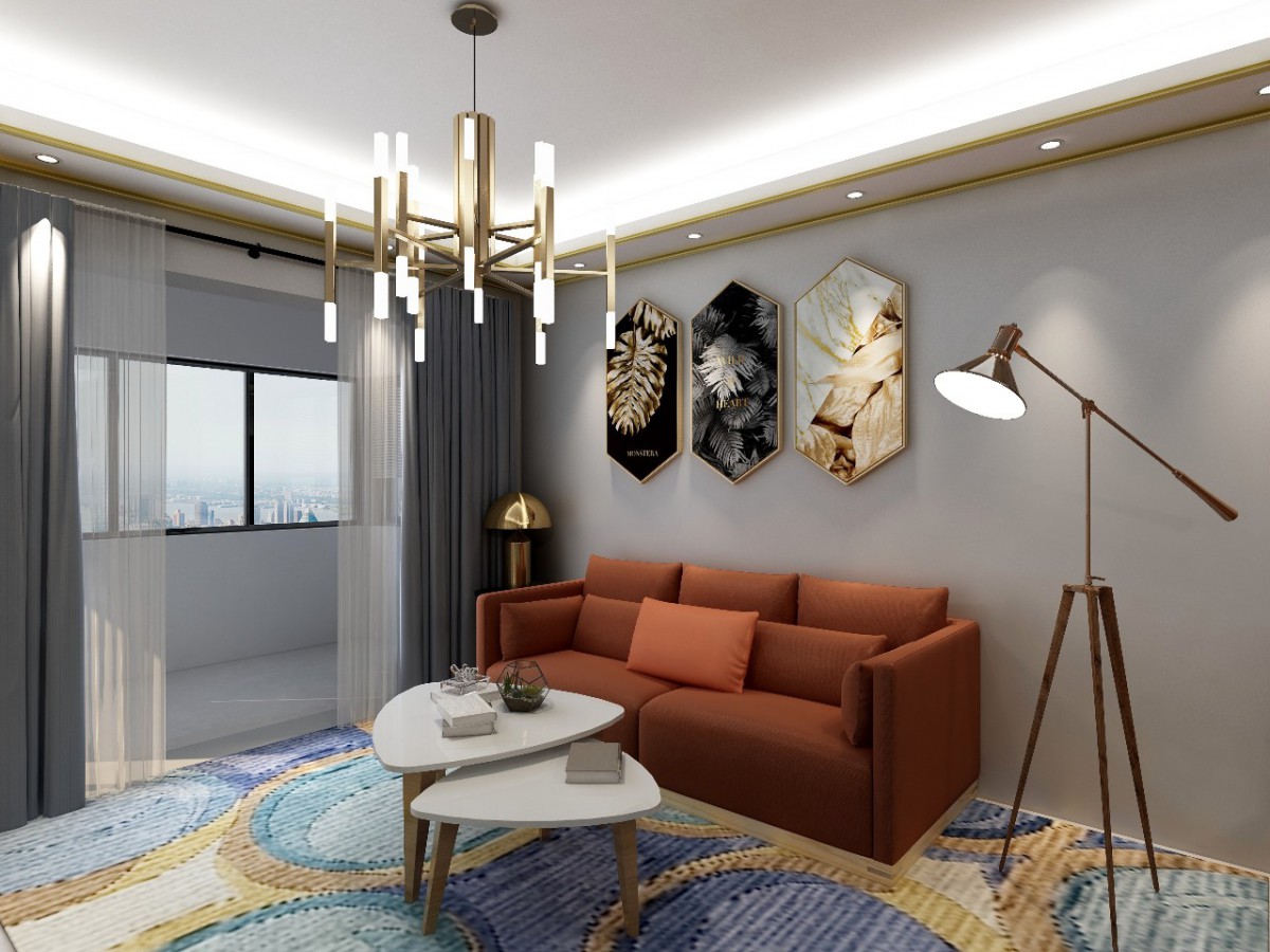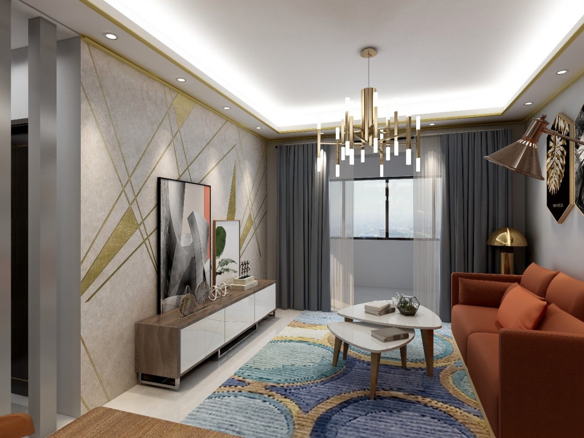 客厅用色大胆,张扬个性,但是整体用的都是相近色系,所以又很和谐。为避免混搭风格带来过多的繁复感,天花板造型简洁,金色装饰线条突出线条感;一圈小射灯与艺术吊灯搭配的恰到好处,充满了现代时尚的韵味;电视墙旁边的另类隔断也选用长线条,既分割了两个功能区,又平衡了客厅的整体色调,稳重不少。