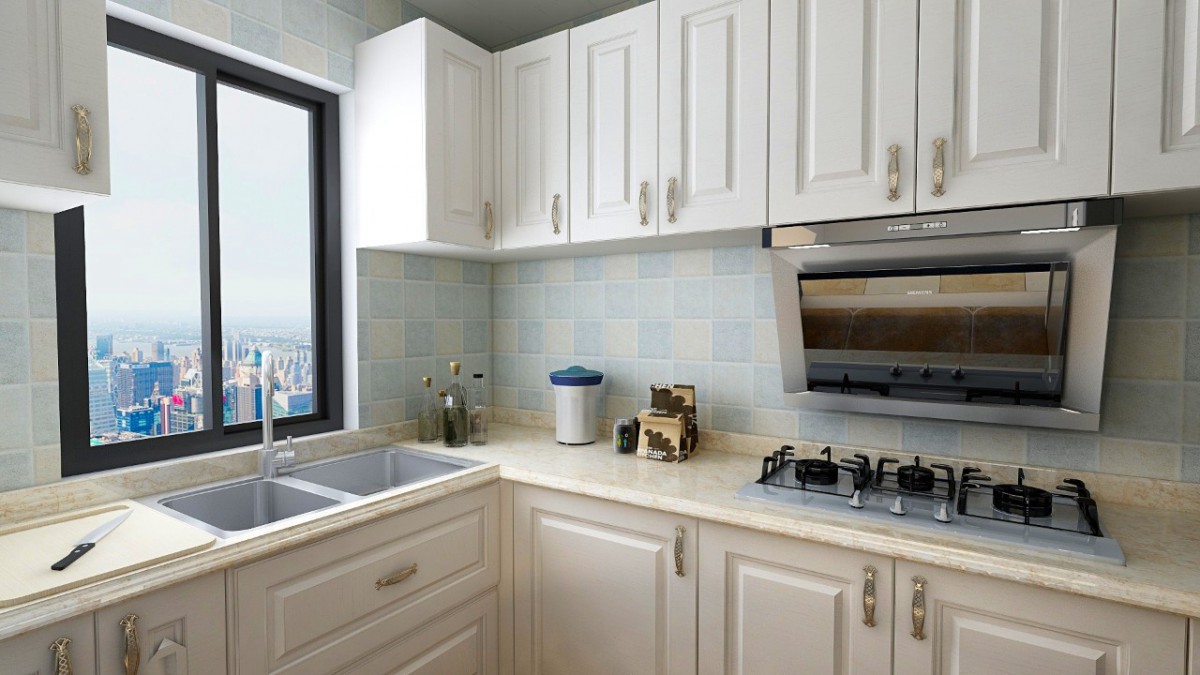 大面积白色橱柜勾勒出洁净通透的厨房空间,墙上若隐若现的浅蓝色瓷砖,再一次呼应了我们别具风情的地中海风格,即使烹饪时间我们也不能错过精彩与浪漫。
