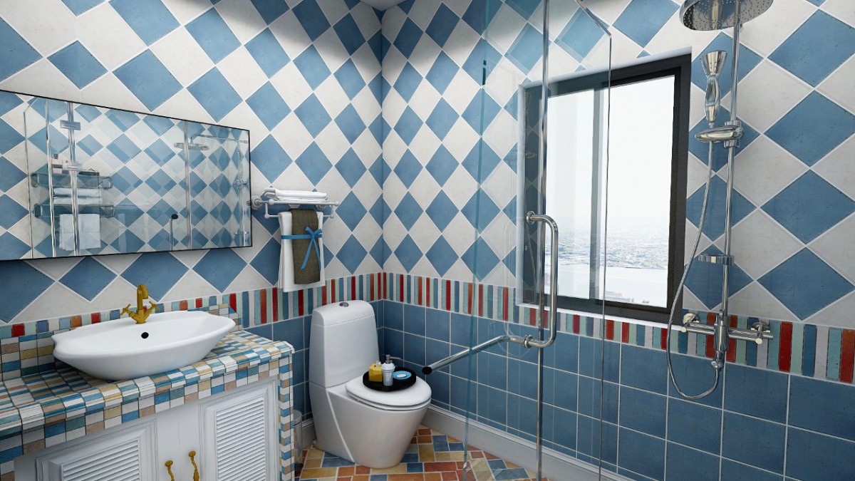 蓝白瓷砖组合,颜色简约明快,彰显出蔚蓝色的浪漫情怀。花砖腰线与地砖加上了红色黄色橙色,热情奔放。干湿分离设计又很好的提高了空间的使用效率,无限贴近生活。