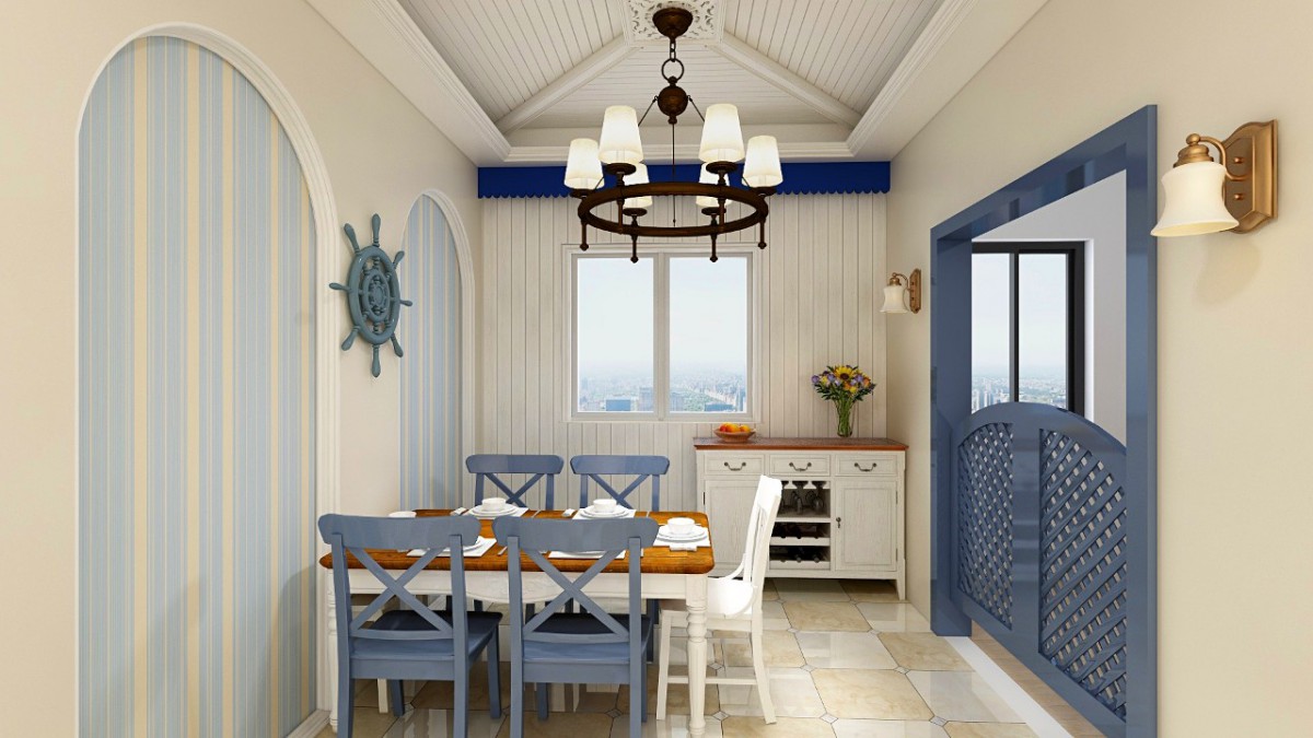 蓝色白色相互交织,勾勒出地中海风情,拱形圆弧与艺术隔栏也是地中海风格的重要构成元素。
