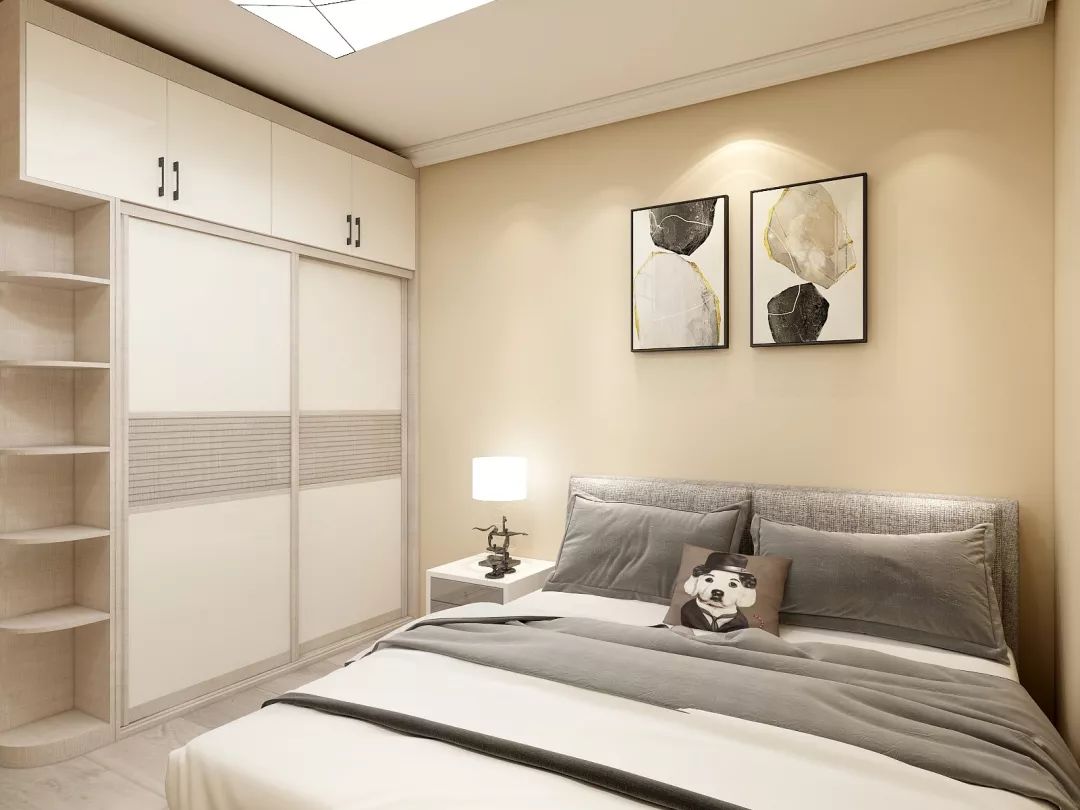 主卧室,第一感觉是温馨,第二感觉是时尚,第三是感觉是现代感满满。色调的搭配上很是温馨舒适,现代的装饰以及床上用具的搭配很是时尚,床头背景墙延续走廊的装饰画,很是高档上档次。