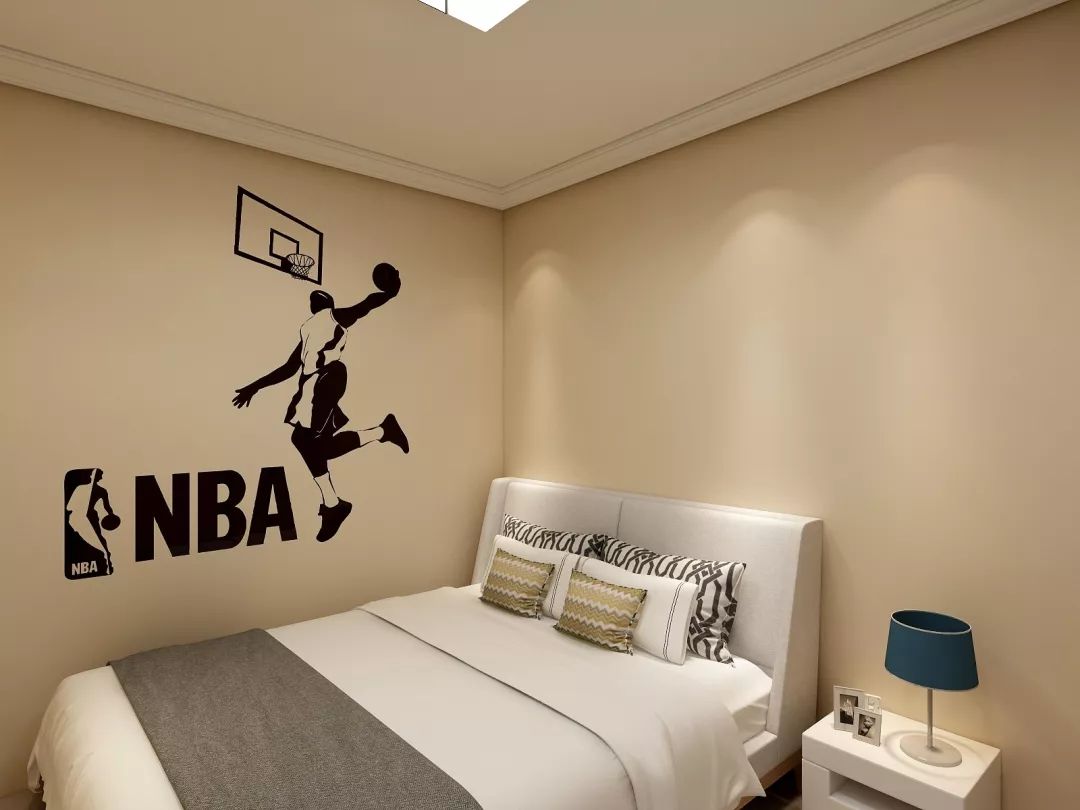 次卧整体以暖色调为主,时下快节奏的生活一切讲究快捷简便,业主家墙面用NBA扣篮装饰贴来装饰,真是实用又好看,也体现了业主对生活的热爱,白色的床单,搭配乌金色的抱枕,让小空间变得充满动感又有活力。