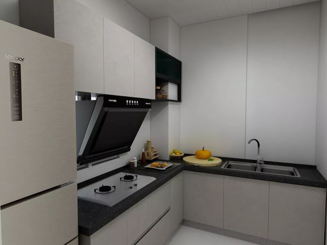 厨房同样选择了灰色系的橱柜,搭配白色瓷砖,也是低调优雅,橱房内的照明区,规避了暗角,这样业主下厨的时候心情也能瞬间明朗起来。每一处都象征着家的味道,象征着爱意的诞生。