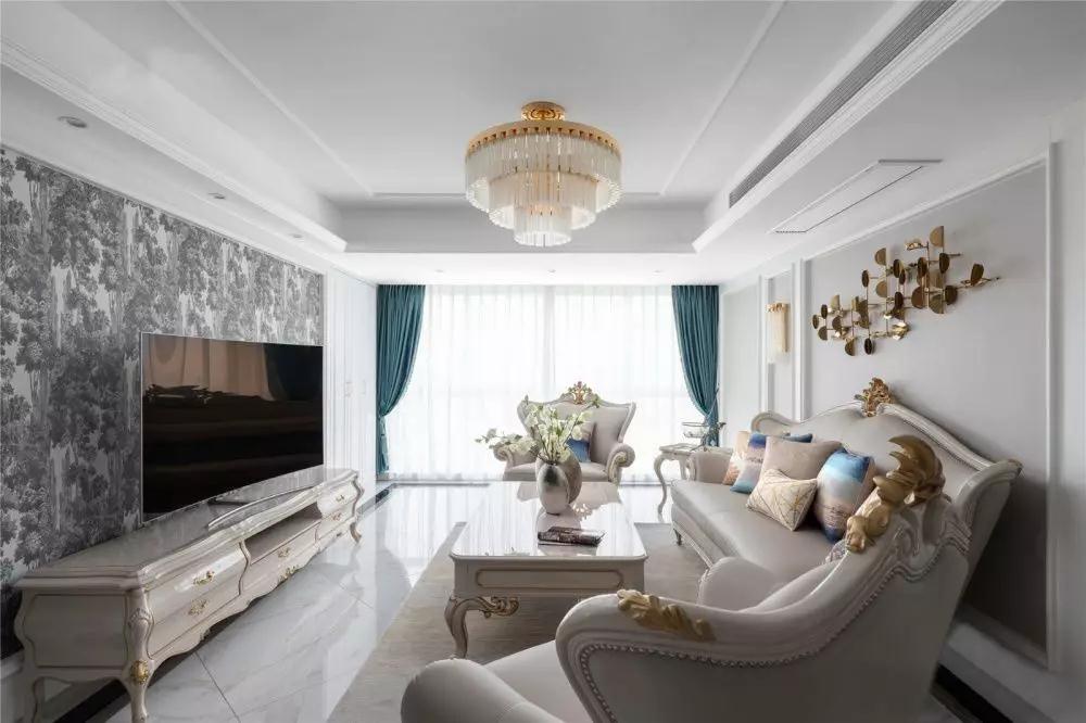 客厅,轻奢优雅的欧式皮沙发,米白色搭配轻奢金,给人大气高级的感受。浅浅的奶油色营造柔和宁静的氛围,带来轻盈与通透的感觉。两面背景墙风格个性十足,尽显空间不凡的气质。