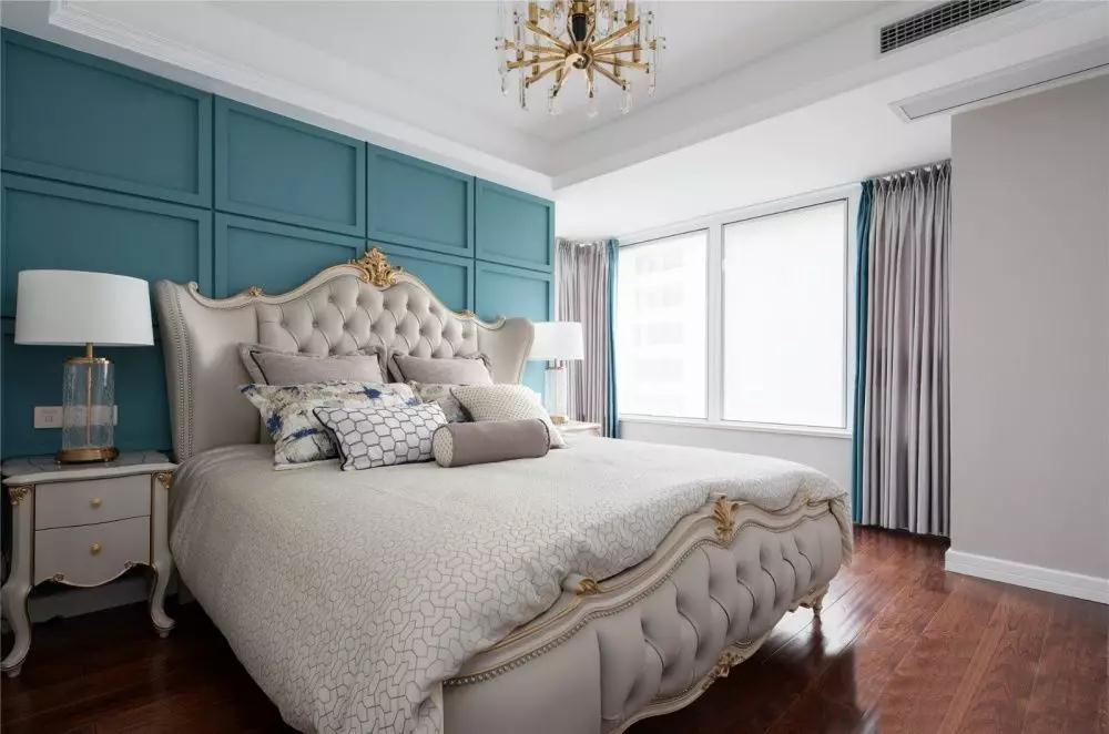 精致华美的欧式大床与整体风格相吻合,床头背景墙无论是造型上还是色彩上都颇有新意,好看的让人眼前一亮。