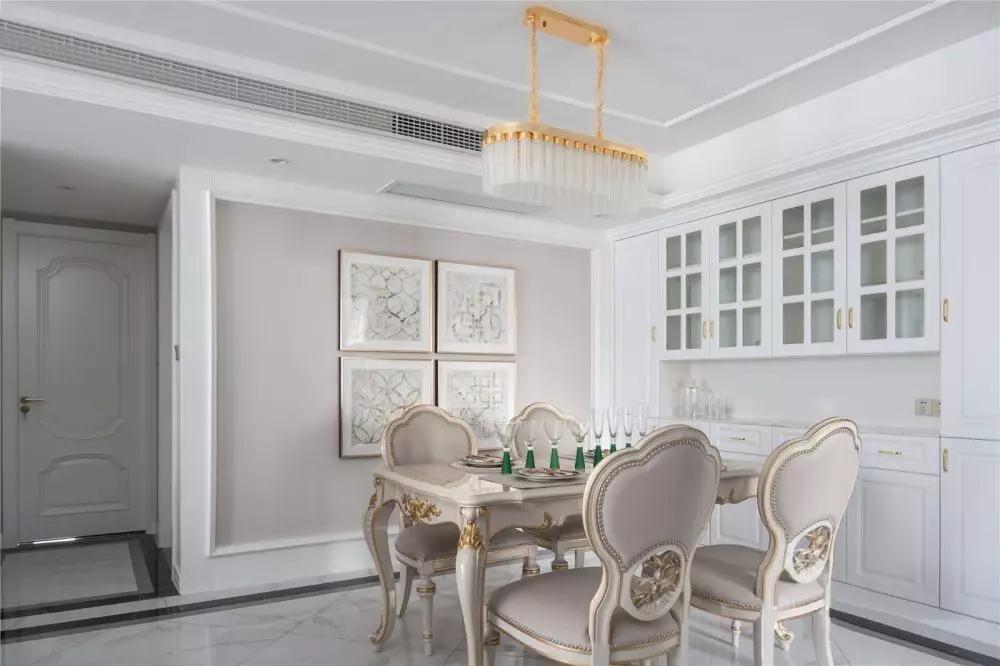 餐厅背景墙以四幅艺术挂画装点,丰富空间层次的同时提升家居品位。餐桌椅与客厅沙发茶几的格调保持一致,搭配奢华吊灯,精致而优雅。