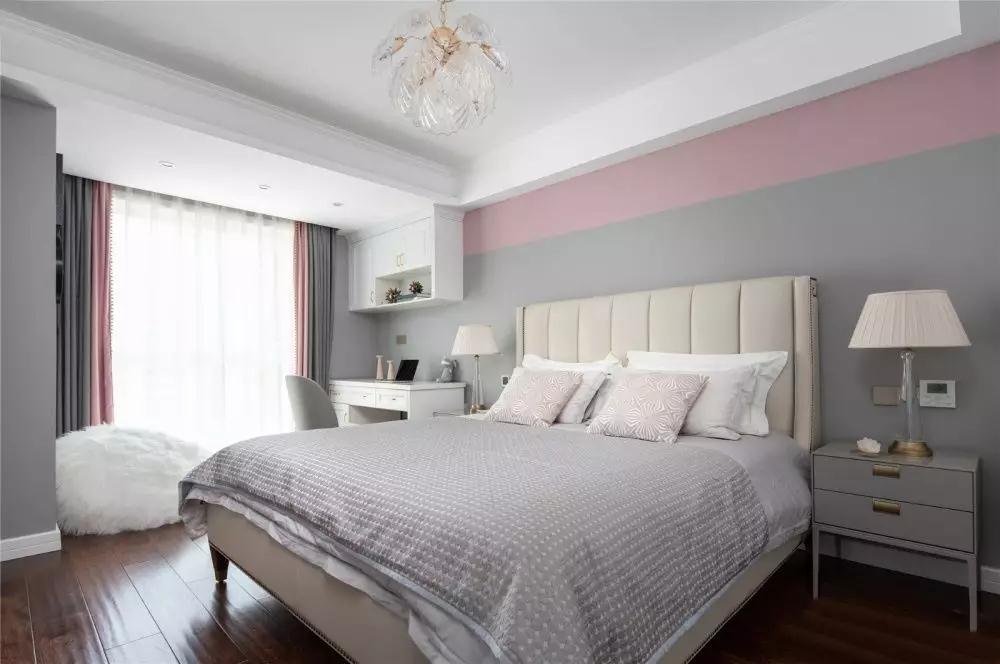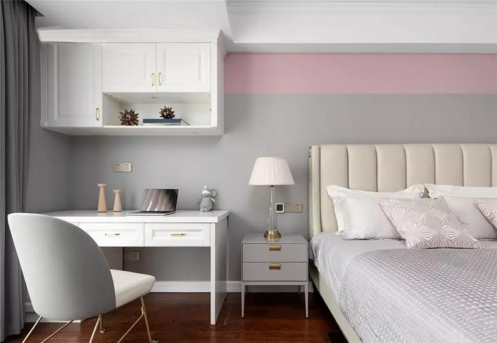 次卧粉灰色调搭配在一起瞬间生出一种高级质感,使空间优雅而柔和。临窗设置了工作区,白色提亮空间,搭配粉灰清爽而亮眼。