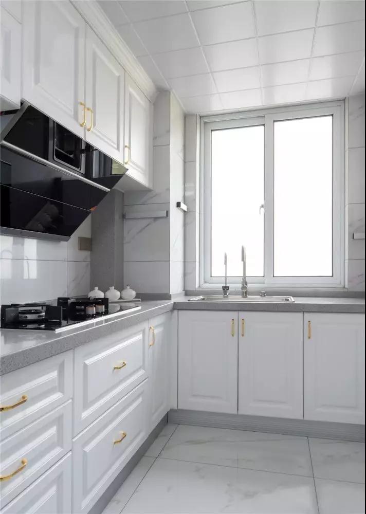 L型布局厨房,白色大理石地砖搭配纯白橱柜,干净明亮。水槽区靠近窗户,不仅采光好还容易风干,保持厨房干燥。