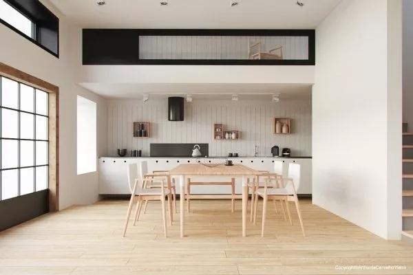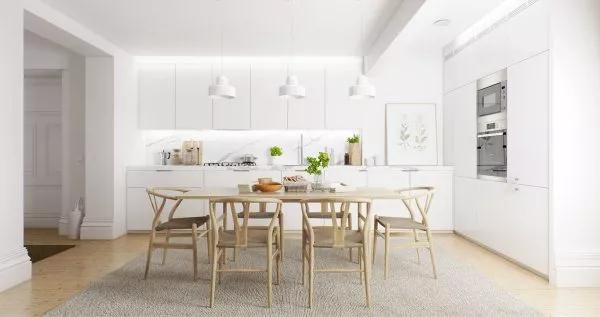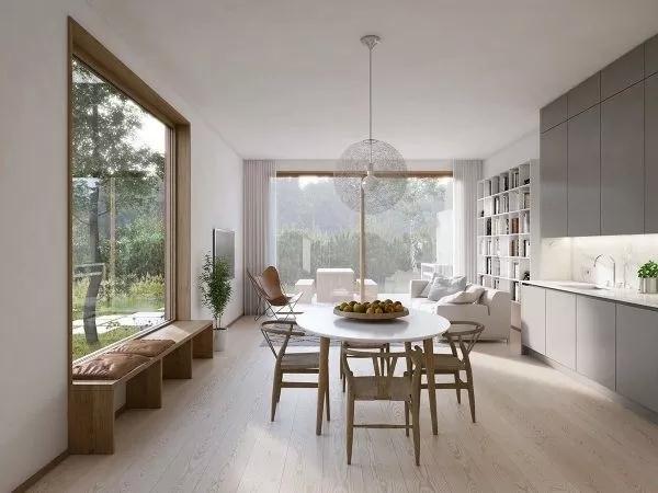餐厅与厨房于同一空间中,橱柜与墙面都是白色调的与温润的木色组成清新、舒适的极简家居空间。