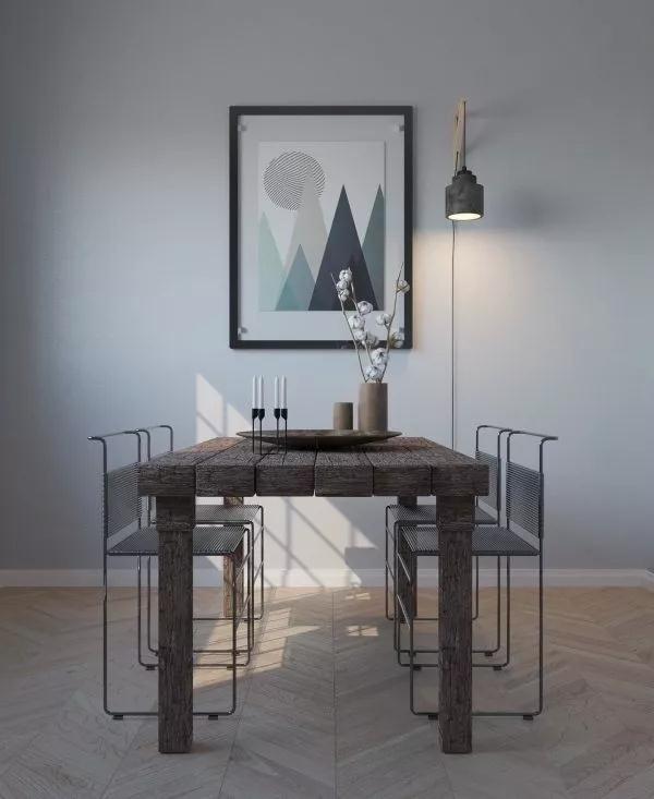 肌理粗犷的餐桌显得比较的笨重、古老,四把金属椅将这种局面打破营造出平衡的极简空间。