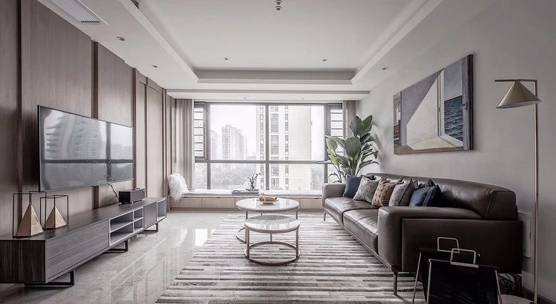 客厅,公共空间设计上是以大为主的,深色沙发搭配圆形茶几,避免日常不小心的磕碰,深得人心又轻盈美观。而且大大的空间满足一家人的需要,对于一家子平时互动还是很有帮助的。