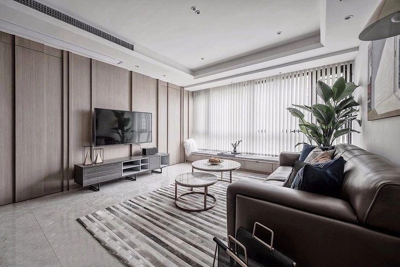 电视背景墙采用竖条纹的木饰面装饰,以防止光面墙体给人带来视觉疲劳,吊顶上用筒灯让室内更加温馨和谐,简单又不乏时尚感。