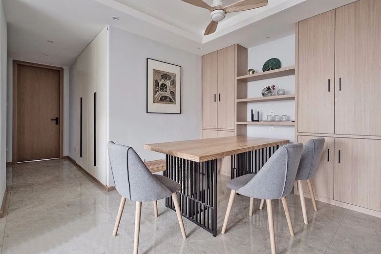 进门的左侧就是餐厅,带有工业风元素的原木餐桌搭配时尚餐椅,温馨自然。边柜中间运用隔板,左右两侧是储物柜,储物得到充分满足。